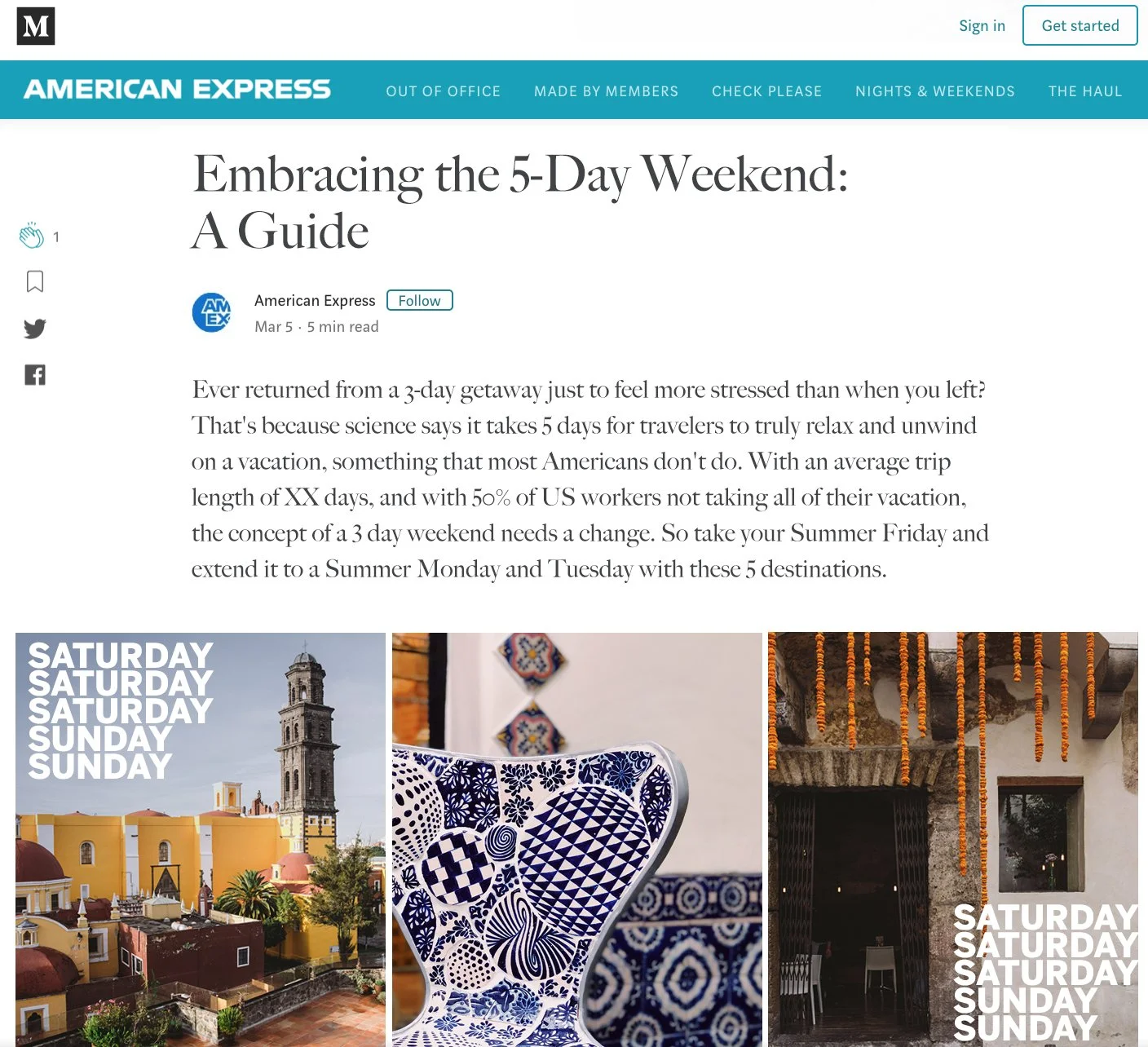 Responsibilities: Over the course of four years, I led the charge to transform Amex Travel’s marketing, shifting their content from boring stock-images of hotel rooms to beautiful, unique and authentic creative. The project came to life through a new creative strategy, a comprehensive social media plan across paid and owned channels and a collective of diverse creators.